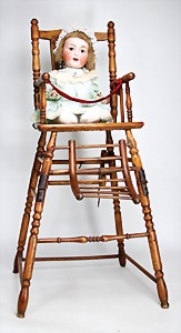 266 / 680 / 7., Biskuit-Porzellan-Charakter-Baby, 48 cm, Kurbelkopf, braune Schlafaugen, off. Mund, Zähne u. Zunge, Sitzbabykörper, dazu 1 Hochstuhl