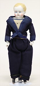 Biskuitporzellan-Brustblattkopf-Puppe, Junge, 31 cm, modellierte Haare, blaue gemalte Augen, geschl. Mund, Stoffkörper, Biskuit-Arme u. -Beine