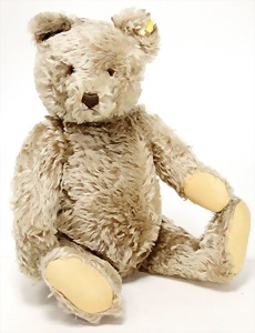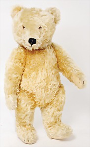 Teddy, 50er Jahre Orig.-Bär, mit Knopf u. gelber Fahne, Nr. 5375,2, Fahne gut leserlich, Filztatzen in gutem Zust., Filzfüße abgeflacht, 70 cm, Mohair in gutem Zust.