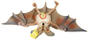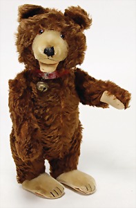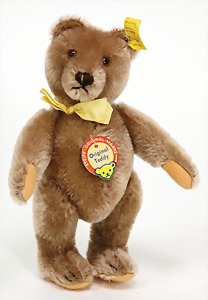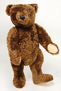 Teddy-Baby, dunkelbraun, mit Resten der US-Zonen Fahne, Knopf im Ohr, Orig.-Halsband, kl. verschlissene Stellen an Filzfüßen, Mohair in gutem Zust., kl. Abriebstelle an der Unterseite der Schnauze, 40 cm, Druckstimme intakt