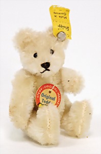 3 Teile, 50er Jahre, Orig.-Teddy, dunkelbraun, mit Knopf, 9 cm, etwas bespielt, weiß, 9 cm, mit Schild, gut, hellbraun, 9 cm, mit Schild, guter Zust.