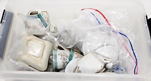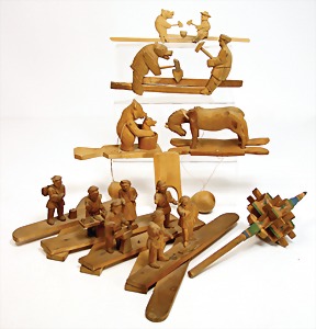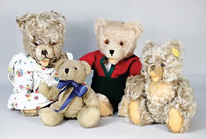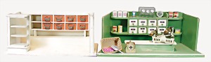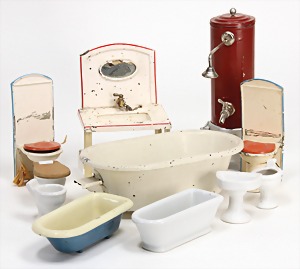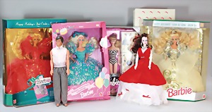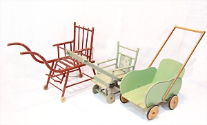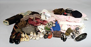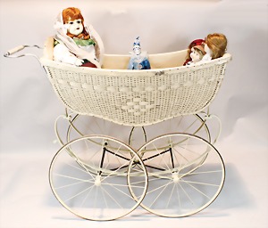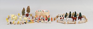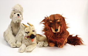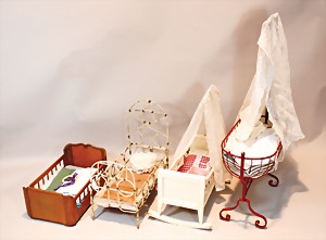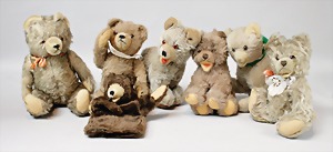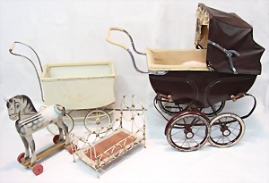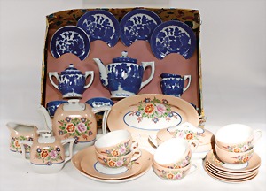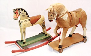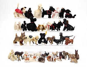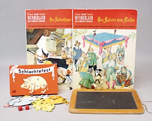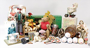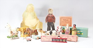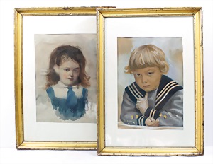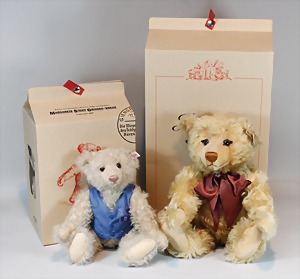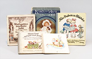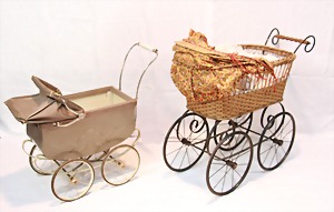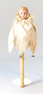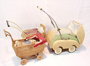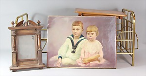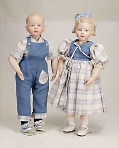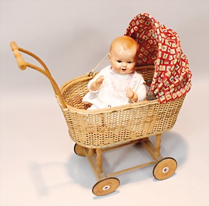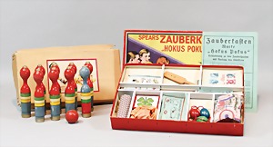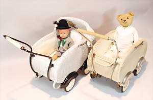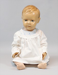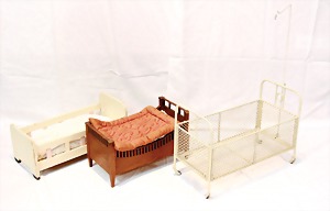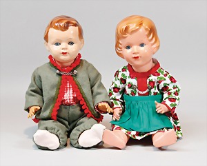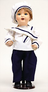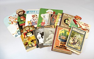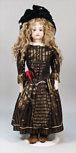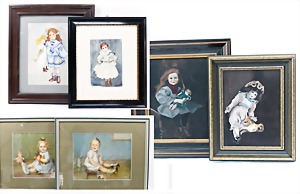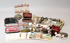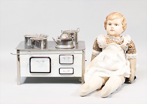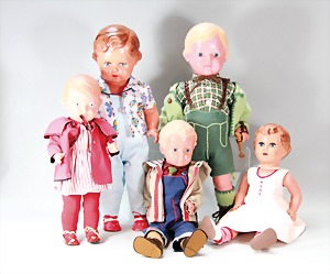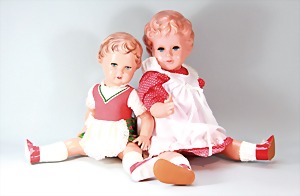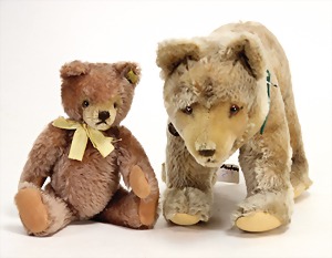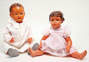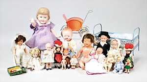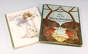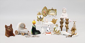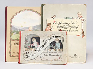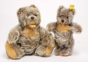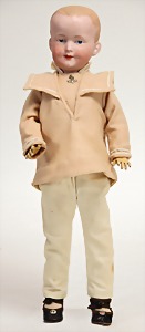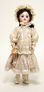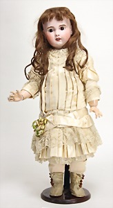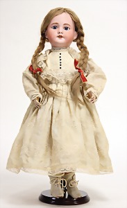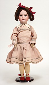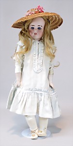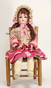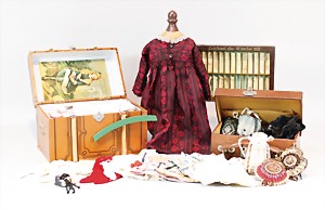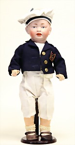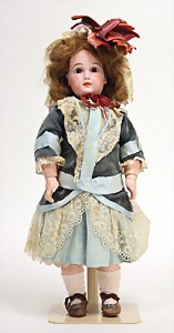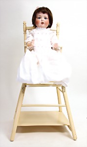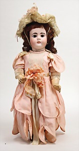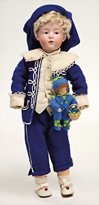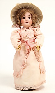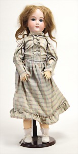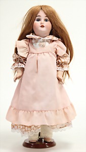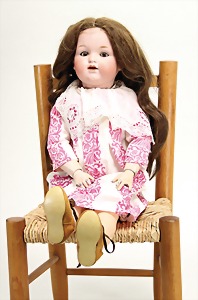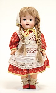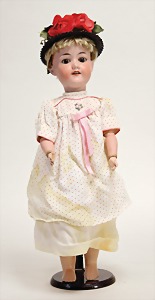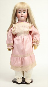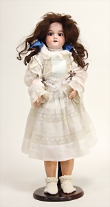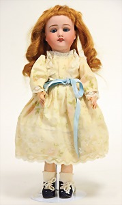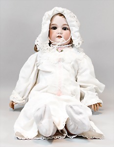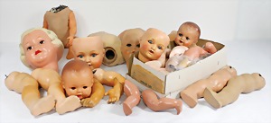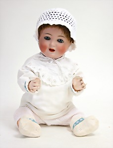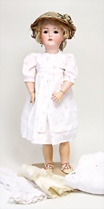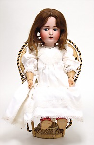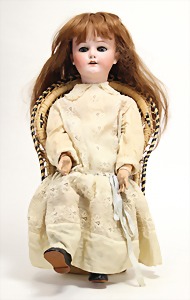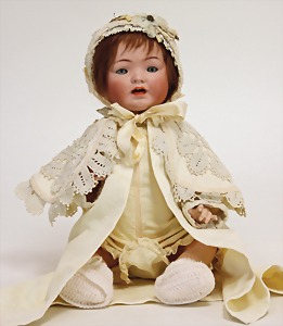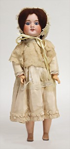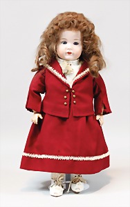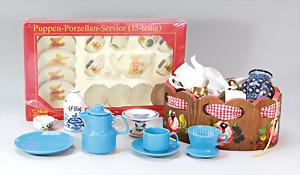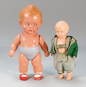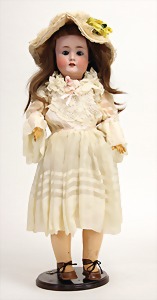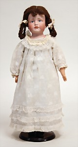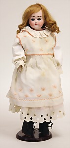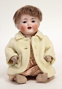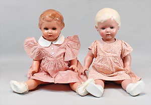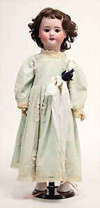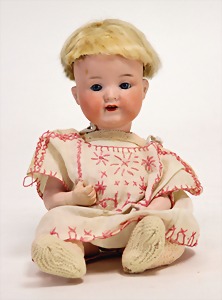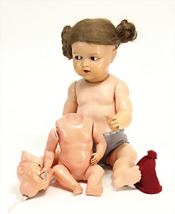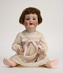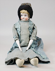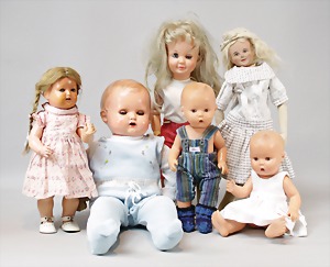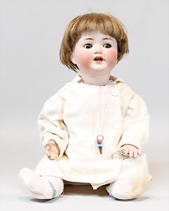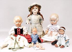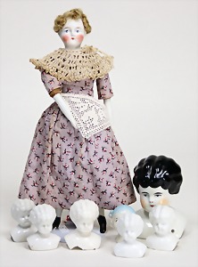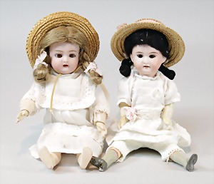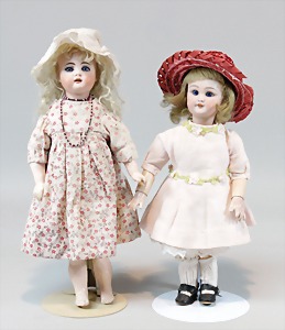 2 Porzellankopf-Puppen, 1 Porzellan-Brustblatt, kl. Risse am Brustblatt, braune fest eingesetzte Glasaugen, geschl. Mund, Korkdeckel, Mohairperücke, Stoffkörper, Porzellan-Unterarme, Körper neuer, 35 cm, 1x Porzellankopf-Puppe, gem. Halbig 1009 Germany, blaue Schlafaugen, off. Mund, Zähne, durchst. Ohren, Mohairperücke, Masse-Gliederkörper, feste Handgelenke, 2 Finger weggebrochen, linkes Bein überstrichen, 27 cm