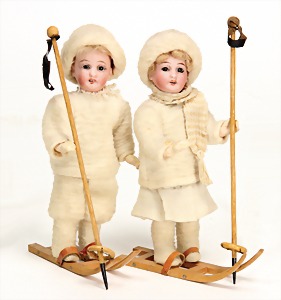 pair of dolls, skier, 17 cm, porcelain heads, with black fix inset glass eyes, opened mouth, teeth, mohair wig was glued on, mass body, dressed, with ski, 1 x stick is missing