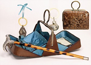 leather bag, embossed leather (toilet cases), 14 x 10 cm, with 2 children's rattles, silver-plated, 1 doll's stick, with handle, silver-plated, 29 cm