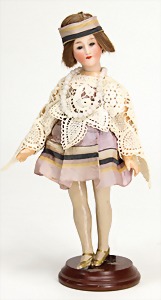 doll with porcelain head, marked 1925/0, brown sleepy eyes, opened mouth, teeth, mohair wig on a jointed mass body, with modelled shoes and socks, 23 cm, clothes sewed of old fabric