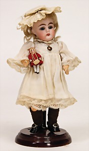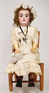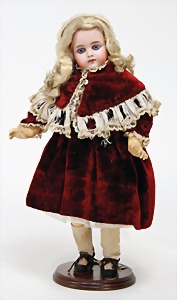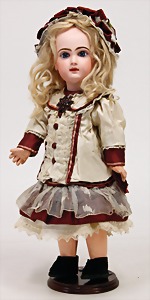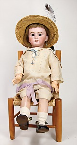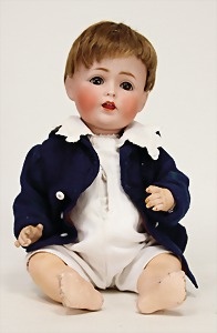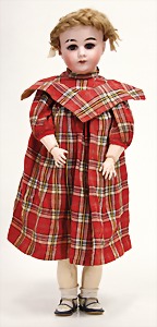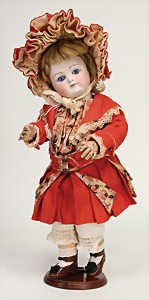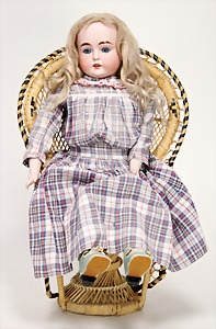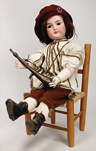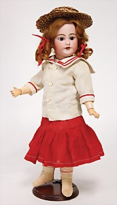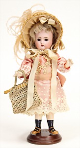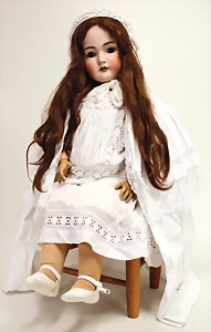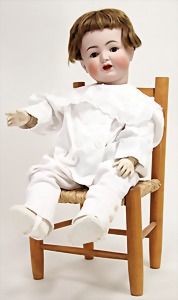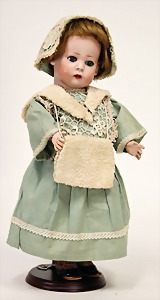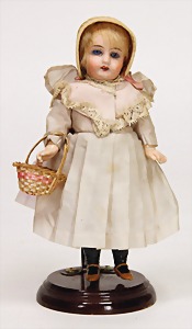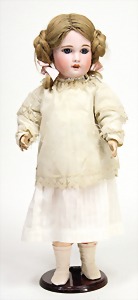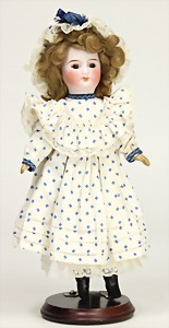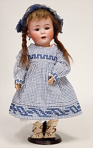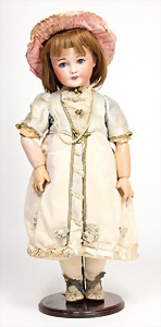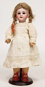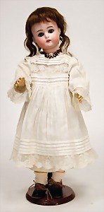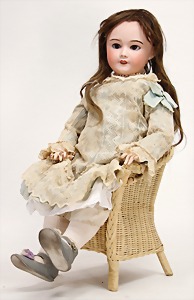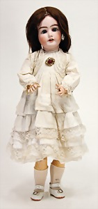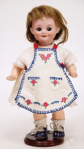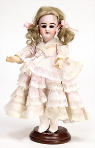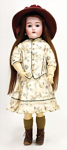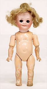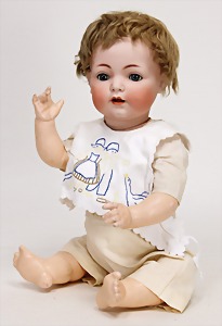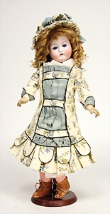 323, Googly, bisque socket head, brown sleepy eyes, closed mouth, standing mass body with jointed arms, wig is more recent