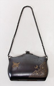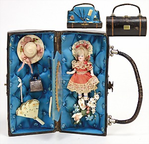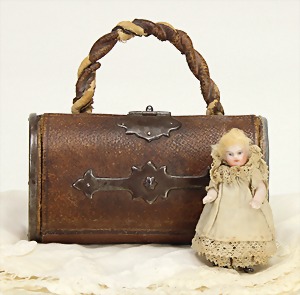 bag for a larger doll, leather with metal fittings made of brass, 15.5 cm, signed "Amalie Nielsen"1880, inside with small all-bisque doll, 9 cm, some accessories, small mirror, hat, bag