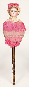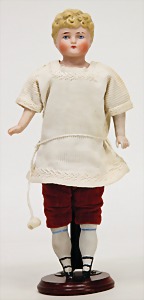 stick puppet, clock mechanism is intact, put on porcelain head, fix inset glass eyes, closed mouth, mohair wig, silk is at some places slightly worn, 33 cm