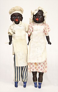 2 mass dolls, male cook and female cook, with pressure mechanism, opens the mouth, brown fix inset glass eyes, heads and arms were over painted, face with formation of spider lines, on a fabric body, lower leg made of mass, with modelled socks, 30 cm, old clothes