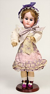 doll with porcelain head, Belton type, marked 3, brown fix inset glass eyes, closed mouth, mohair wig, on a standing mass body, jointed arms and legs, modelled boots, 26 cm, clothes were over sewed