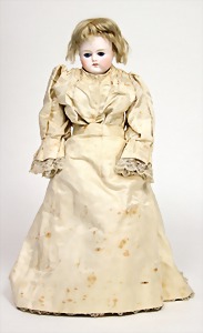doll with porcelain head, for Jumeau, marked 1907, blue fix inset paperweight eyes, opened mouth, teeth, pierced ears, cork cover was fix glued on, mohair wig, French jointed body, right hand and right thighs were repaired, 61 cm, clothes old or sewed of old fabric, old fabric shoes, from outside are no flaws visible