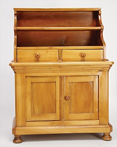doll's chest of drawers, height: 50 cm, width: 37 cm, around c. 1890, doors down below can be opened, at the top drawers and shelves, nice decoration for a c. 46 cm tall doll