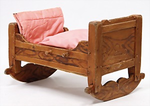 early doll cradle, around 1800, width: 34 cm, wood, with plugs, nice decoration for a very early doll, original varnish