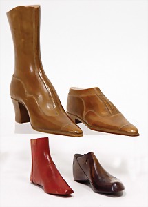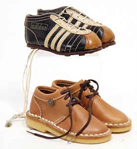 football shoes for dolls, leather, 10.5 cm, probably '30s - '50s, 1 cleat is missing, with a pair of children's shoes that are more recent