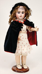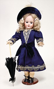 doll with porcelain head, marked DEP 1009, FT, brown sleepy eyes, opened mouth, teeth, pierced ears, mohair wig, on a jointed mass body, with ball-and-socket joints, 48 cm, clothes were over sewed, with 1 doll umbrella, oilcloth shoes