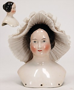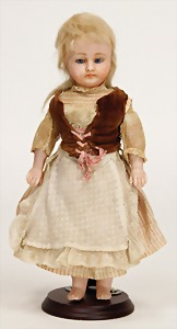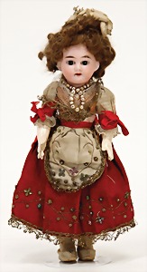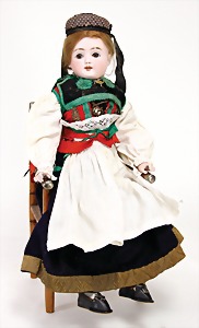 porcelain shoulder headed doll, marked H 1/2, brown sleepy eyes, opened mouth, teeth, head is bent to the side, real hair wig, on a fabric body, porcelain forearms, 1 thumb and 2 fingertips are break off, 50 cm, nice old clothes (traditional costume)