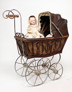 baby with porcelain head, marked GRETE 4/0 DEP, blue sleepy eyes, opened mouth, 2 upper teeth, real hair wig, on a baby with sitting massbody, 25 cm, with 1 doll's pram, basket, cast spoke wheels, handle wood, height of handle 58 cm
