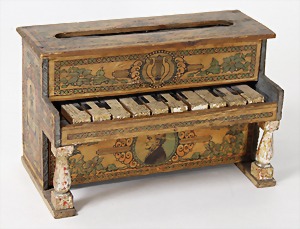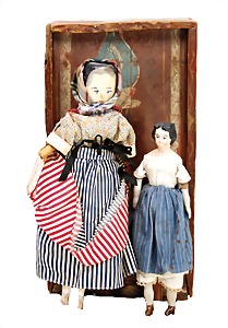 wood doll, 30 cm, colored frame, jointed arms and legs, 1 arm is loosely, papier mâché shoulder headed doll, fabric body, bisque arms and legs, 24 cm, old clothes, with colored wooden box
