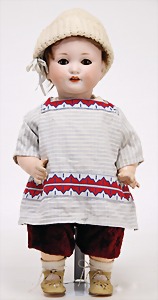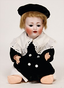 colored bisque porcelain character doll, marked 101, socket head, brown painted eyes, closed mouth, hairline crack from the top of head to the left eye, mohair wig, on a dark colored jointed body, 39 cm, clothes were over sewed