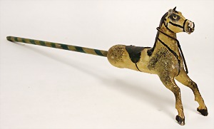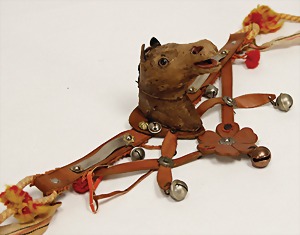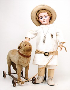 doll with porcelain head, marked 306 DEP 17, blue fix inset paperweight-eyes, opened mouth, teeth, pierced ears, real hair wig, on a jointed wood/mass body, legs and armswith some holes that are caused by wood-worms, 73 cm, old clothes, along with it St. Bernard dog, straw stuffed, on iron wheels, with pull voice, strongly worned, 45 cm, along with it a doll magazine, with the history of this doll