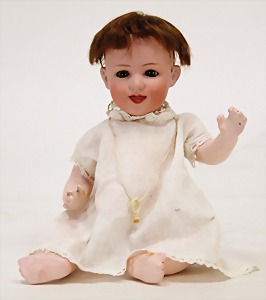 smiling child, marked Germany 3 1/2, brown sleepy eyes, opened mouth, 2 lower teeth, tongue, modelled, head is throughout pink dyed, on a sitting mass baby body, with stick-out toe, 26 cm