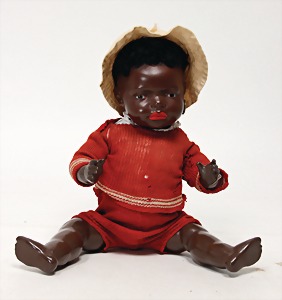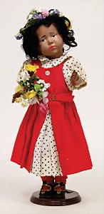 444.6/0, squirted porcelain, colored boy, 34 cm, wig is fix glued on, wasn't removed, brown sleepy eyes, closed mouth, pierced ears, 1 earring, please note that it is risky to transport the eye mechanism, standing body, jointed arms and legs