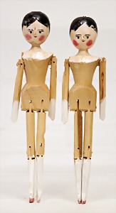 2 wooden dolls, jointed arms and legs, painted faces with wooden noses, 24.5 cm and 25 cm