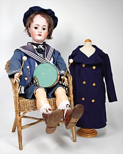 doll with porcelain head, marked 4711, Germany 105, brown sleepy eyes, opened mouth, teeth, real hair wig, slightly wig pull, on a jointed mass body, with ball-and-socket joints, 98 cm, with old sailor suit, whistle, leather shoes, small tin drum