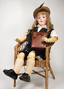 doll with porcelain head, marked K&R, blue sleepy eyes, opened mouth, teeth, pierced ears, cork cover, real hair wig, back of the head is restored, on a jointed mass body with ball-and-socket joints, clothes sewed of old fabric, with leather bag