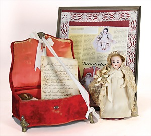 doll with porcelain head, marked K&R, blue fix inset glass eyes, opened mouth, teeth, real hair wig, head is fix glued on a mass body , jointed arms and legs, modelled shoes and socks, 17 cm, dressed like a bride, along with it a nice velvet-casket, with brooch with photo and small handwritten letter "Zur Beherzigung für die junge Frau" and a framed report about the receipt of this doll
