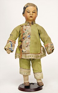 fabric doll, Asian, painted, color at head is strongly wear down, fabric comes at 1 place open, 36 cm, old clothes