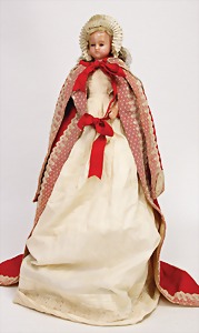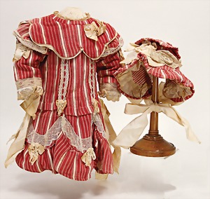 nice old doll dress, with hood, fabric is in places slightly faded, braid and ribbons are slightly discolored, for a c. 55 cm - 60 cm tall doll
