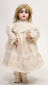 1894, doll with bisque head, 25 cm, socket head, brown fix inset glass eyes, closed mouth, standing mass body, old clothes, underwear, shoes and socks, mohair wig