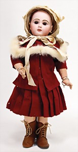 doll with porcelain head, marked 13, blue sleepy eyes, opened mouth, teeth, pierced ears, real hair wig, jointed mass body, with ball-and-socket joints, 64 cm, clothes old or sewed of old fabric, leather boots