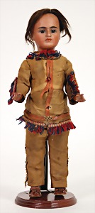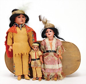 3 Indian dolls, not marked 1x 15 cm, bisque socket head, fix inset brown glass eyes, closed mouth, standing mass body, 1x 20 cm, AM, bisque socket head, brown fix inset glass eyes, opened mouth, head was glued, standing mass body, not marked, 1x 27 cm, bisque socket head, fix inset brown glass eyes, opened mouth, upper teeth, standing mass body, modelled shoes, original mohair wigs, in a box made of chipboard