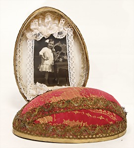 papier mâché egg, with music mechanism, clock mechanism is intact, lined with fabric and beads, 1 old photo of a child , egg 18 cm x 12 cm