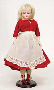teenager doll, marked A 300 M, 23 cm, bisque socket head, blue sleepy eyes, tear at neck, standing mass body, with up-painted shoes and socks, real hair wig, 1 tiptoe is knocked, rubbers are slightly loosely