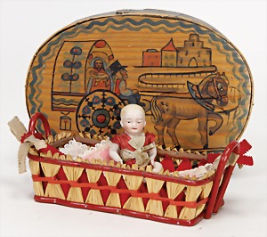 Kewpie, 11 cm, all-bisque, painted eyes, closed mouth, jointed arms and legs, with small Biedermeier basket, in a box made of chipboard