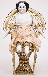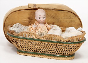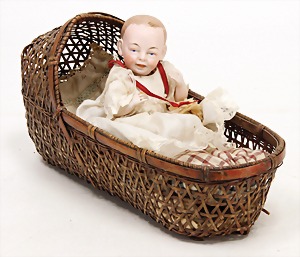 small all-bisque doll, 15 cm, swivel head, modelled hair, painted eyes, opened/closed mouth, sitting baby body, legs were glued, 1 finger was supplemented, head in good condition, very expressive, with early basket