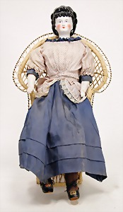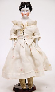 doll, China Head, enameled porcelain, 33 cm, modelled hair, painted eyes, closed mouth, leather body, enameled porcelain arms, old clothes