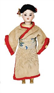 Oriental, porcelain socket head, marked 21 Germany 164, brown sleepy eyes, opened mouth, teeth, real hair wig, strongly hairloss, standing mass body, with ball-and-socket joints, 33 cm, clothes were over sewed