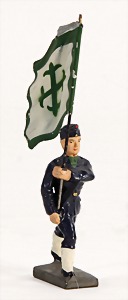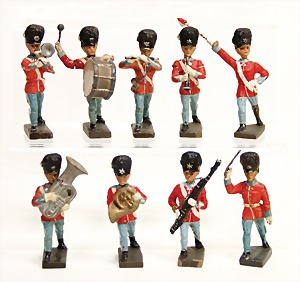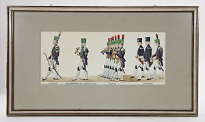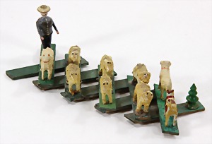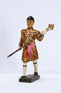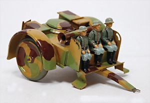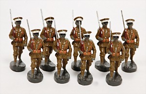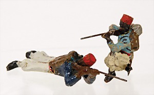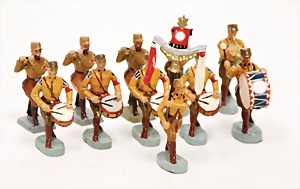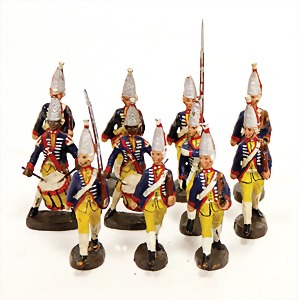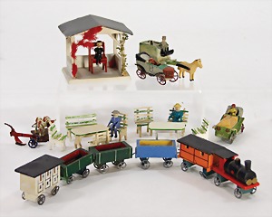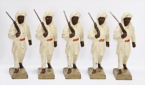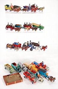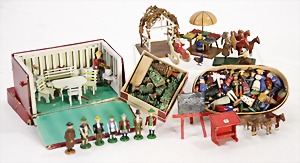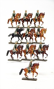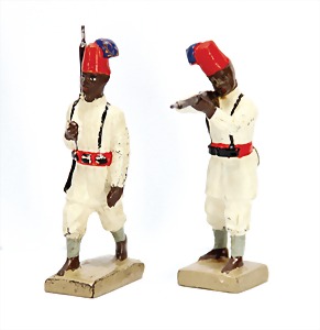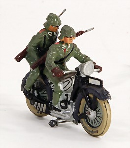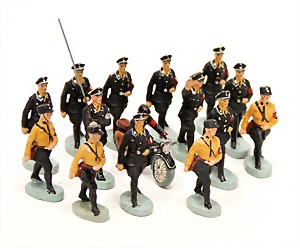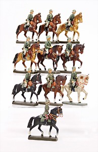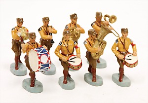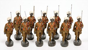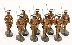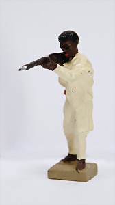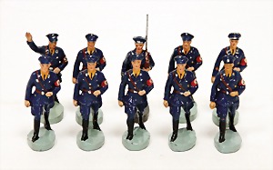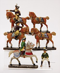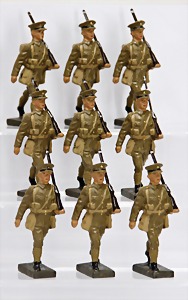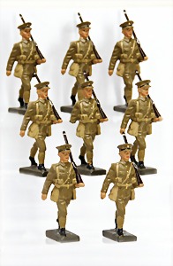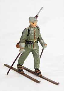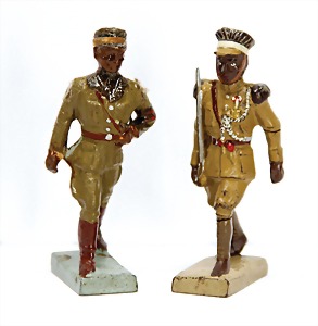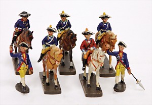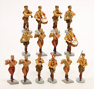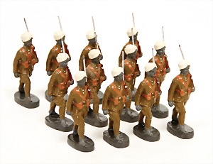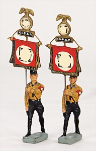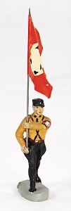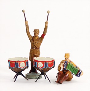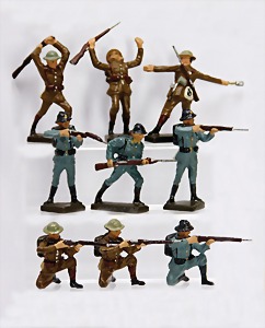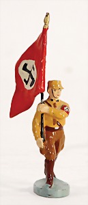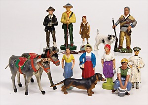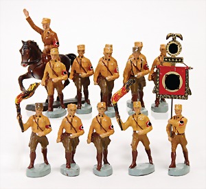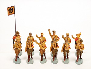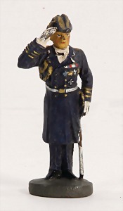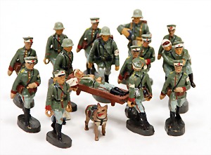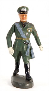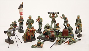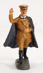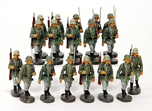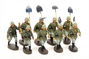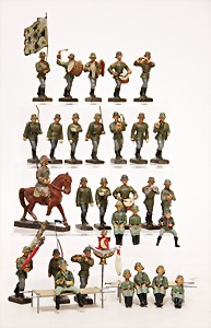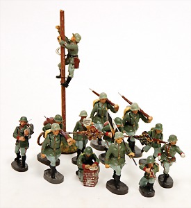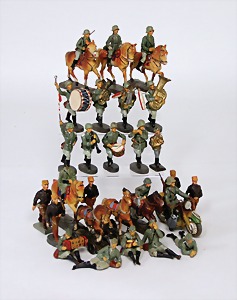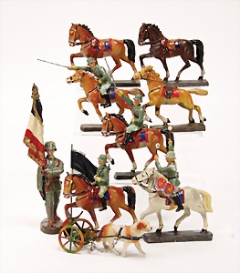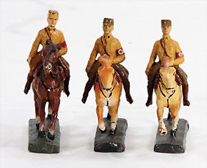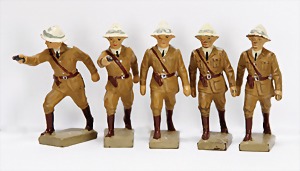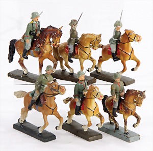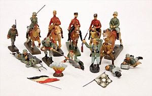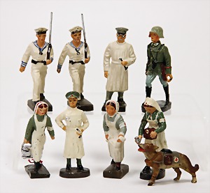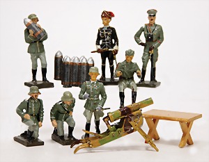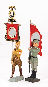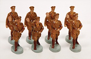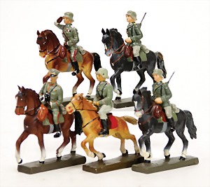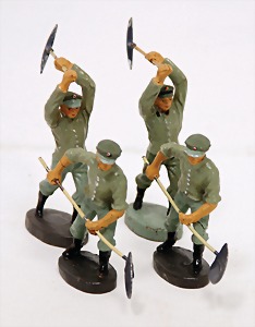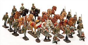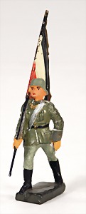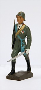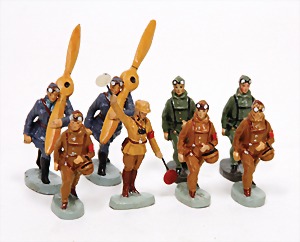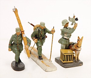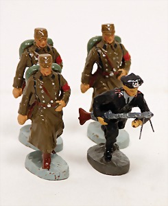 4 pieces Elastolin, mass, Second World War, 7.5 cm, officers, marching, 1 x with binoculars and bag at the side, satchel on the back, 1 officer with binoculars and sword, 1 figure with jointed arm, 1 figure Air Force, marching with sword, 2 lineol figures, condition 1-2