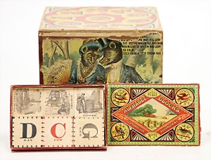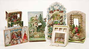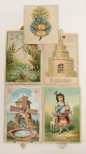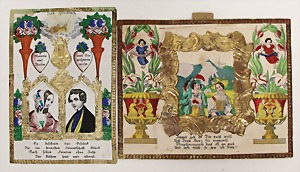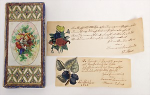congratulation cards, 1862 - 1865, multicolored lithographed casket , 4 paper strips with writing and illustrations, flowers and fruits