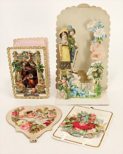 mixed lot of cards, 19.5 cm, twosome, paradise garden, 12 cm, floral decorations with pigeons, 12 cm, heart with pull mechanism, 12.5 cm