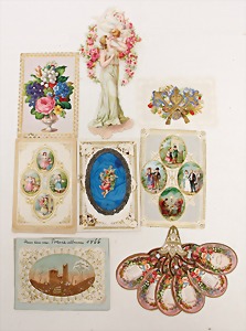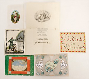 mixed lot of 12 pieces, 1825 - 1900, congratulation cards, partially handcoloured, 1 postcard, 1 embroidered picture, with small casket