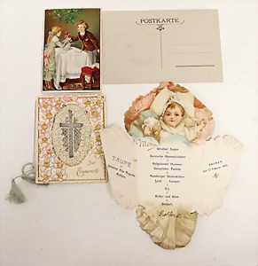 mixed lot of 6 congratulation cards, among them 1 folded card, with patches with flaws, 1 card with pull mechanism, with 1 menu for the baptism, it is down below slightly creased, 1880 - 1910