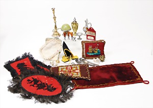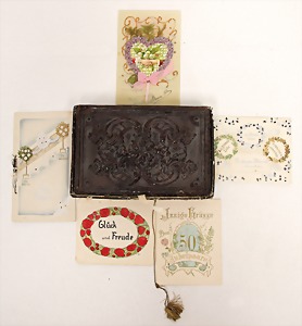 small boxes, with baptismal letter, set up-congratulation card, small patches with flaws, rose of Ems, rose of Breslau, 2 postcards made of celluloid, congratulation cards, mostly from around 1900, with small casket