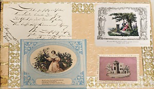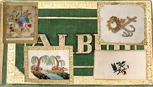 W. F. S. casket with loosely sheets, only few are write on, very nice picture inside, 3 pictures with silk embroidery, c. 1850