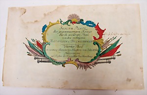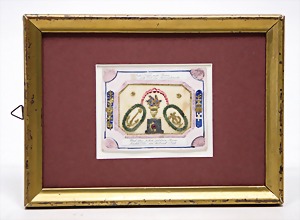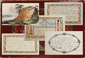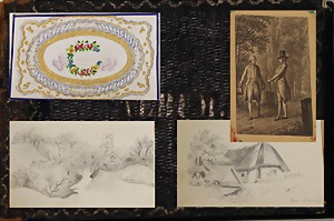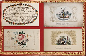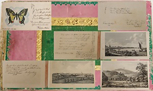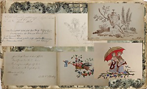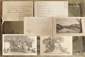 monument of friendship for Berta, 1821 - 1828, 4 Viennese Billetts, 1 colored copperplate engraving, 1 embroidery, 1 hair picture, 1 watercolor, 2 copperplate prints, many pages weren't labeled