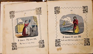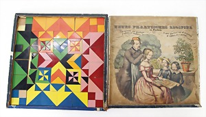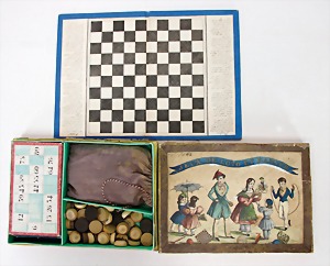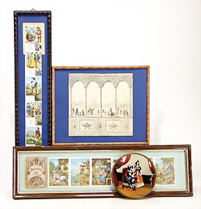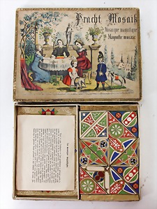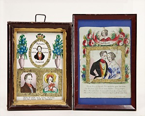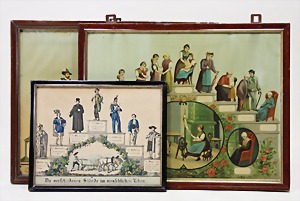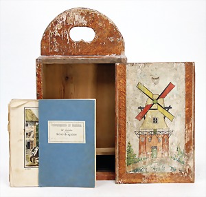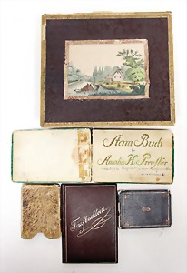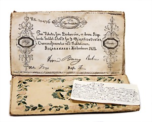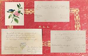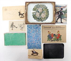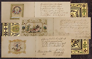 casket, with chromolithography, inside mirrored, small album, with aphorisms, illustrations, 1 handcoloured chromolithography, 1840 - 1843, 7 x 10 cm, 1 album, 1838 - 1884, sheets are only partly labeled, 2 handcoloured chromolithographies, 1 small  christening book, 1911